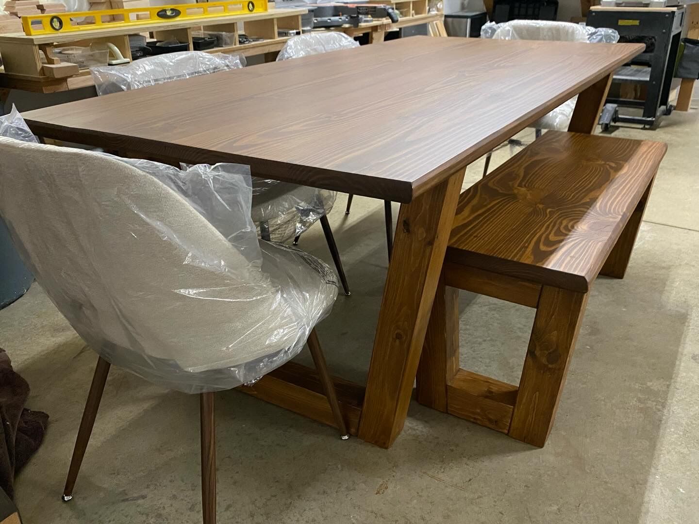 6.5ft Modern Dining Table. Oil Stained Early American. Matching Bench and 4 Beige Upholstered Chair. Finished in Matte Polyurethane.