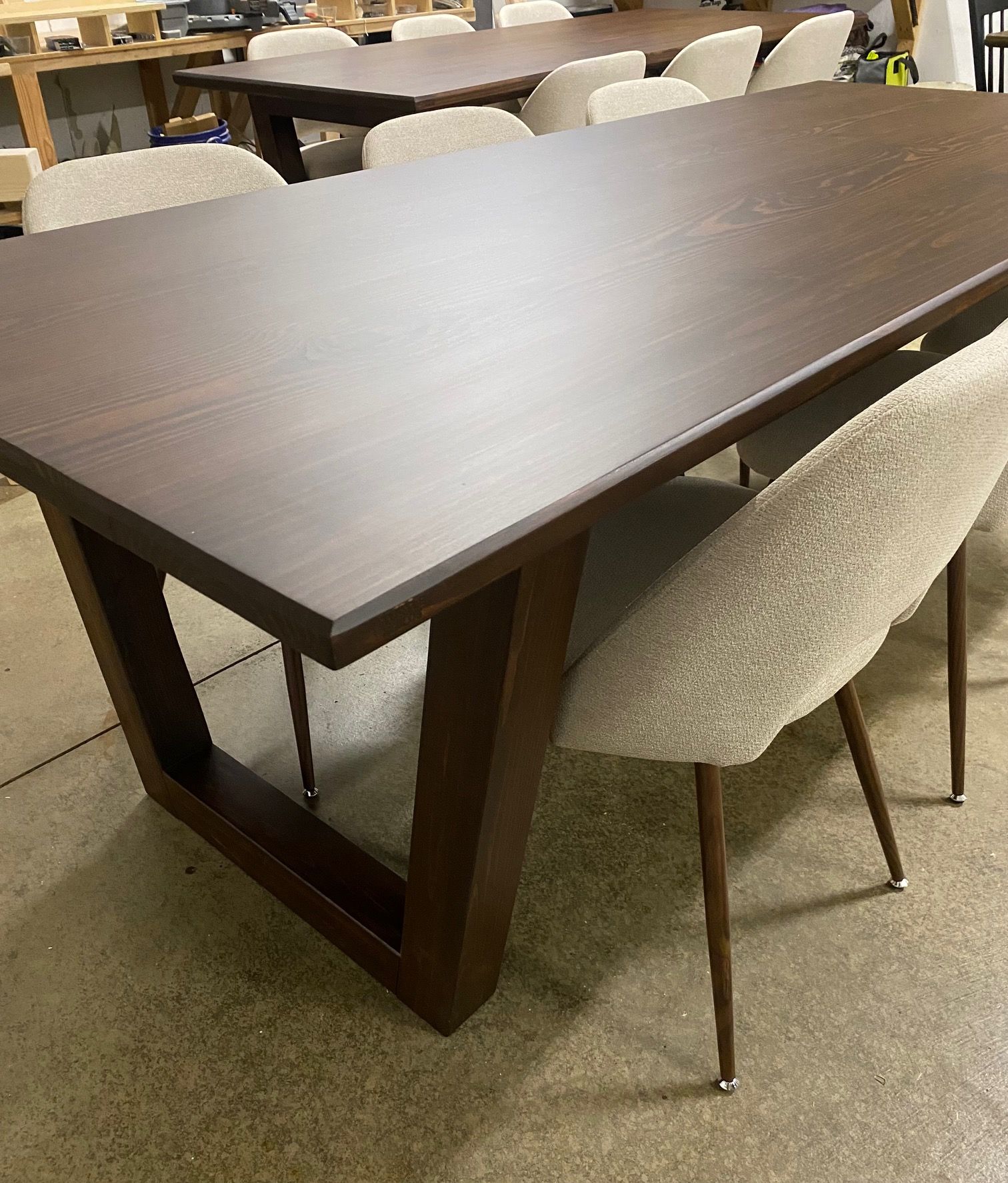7.5ft Modern Dining Table. Oil Stained Simply Dark Walnut Brown. 6 Beige Upholstered Modern Dining Chairs. Finished in Matte Oil Polyurethane.