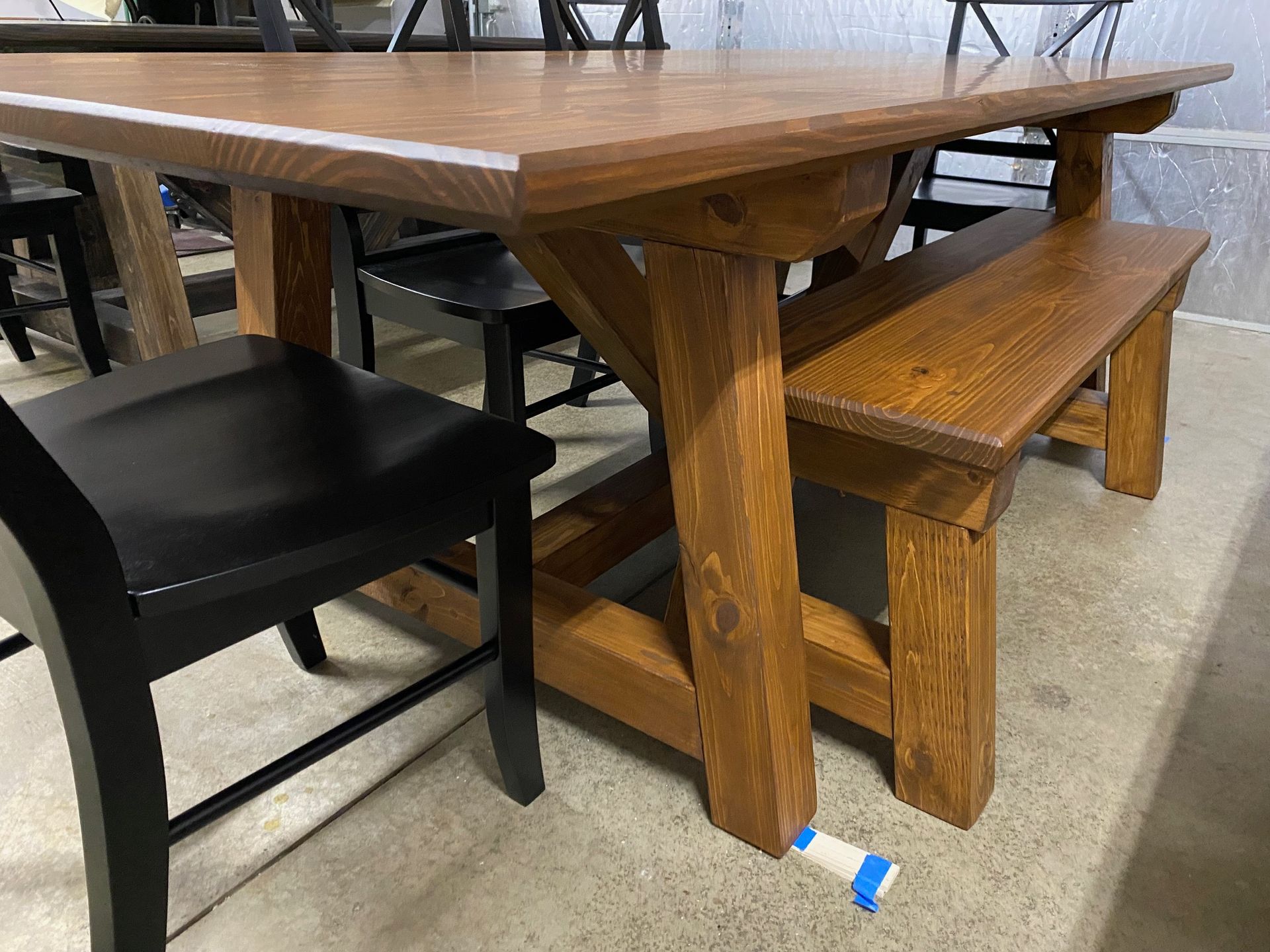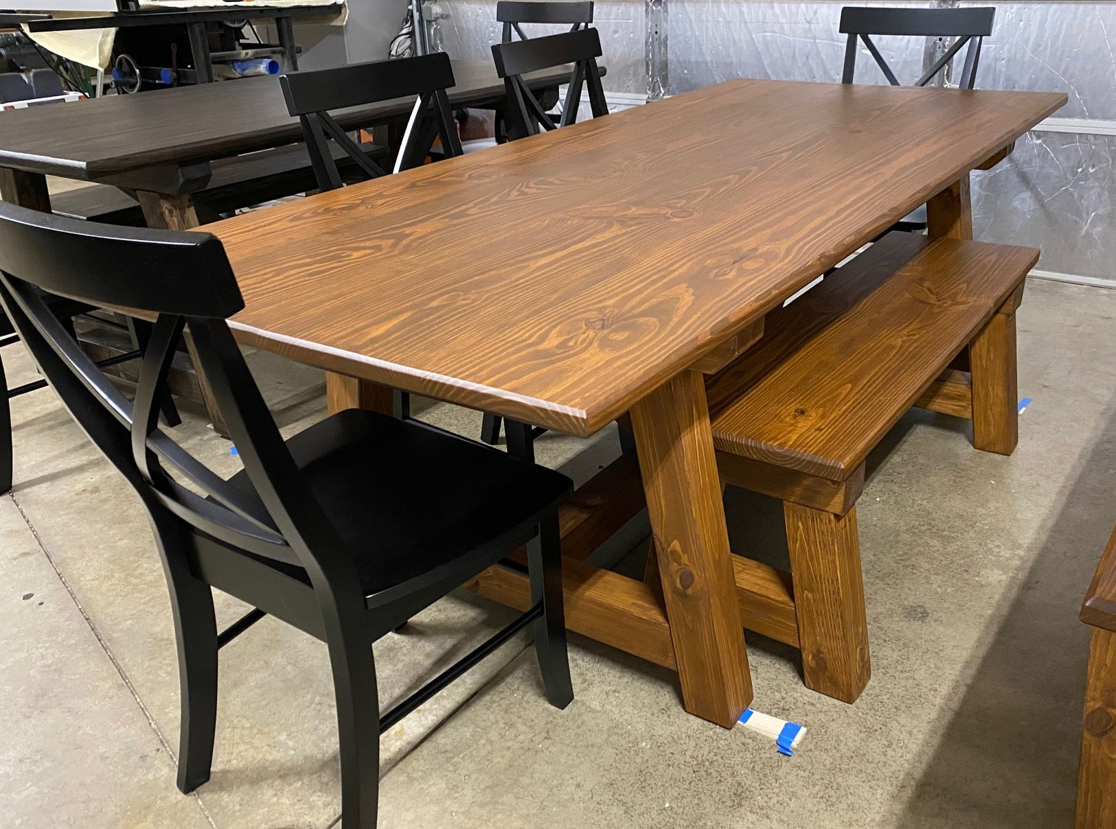 7.5ft Trestle Dining Table and Seating Bench. Oil Stained Early American Premium. 4 Black Farmhouse Chairs. Finished in Matte Polyurethane.