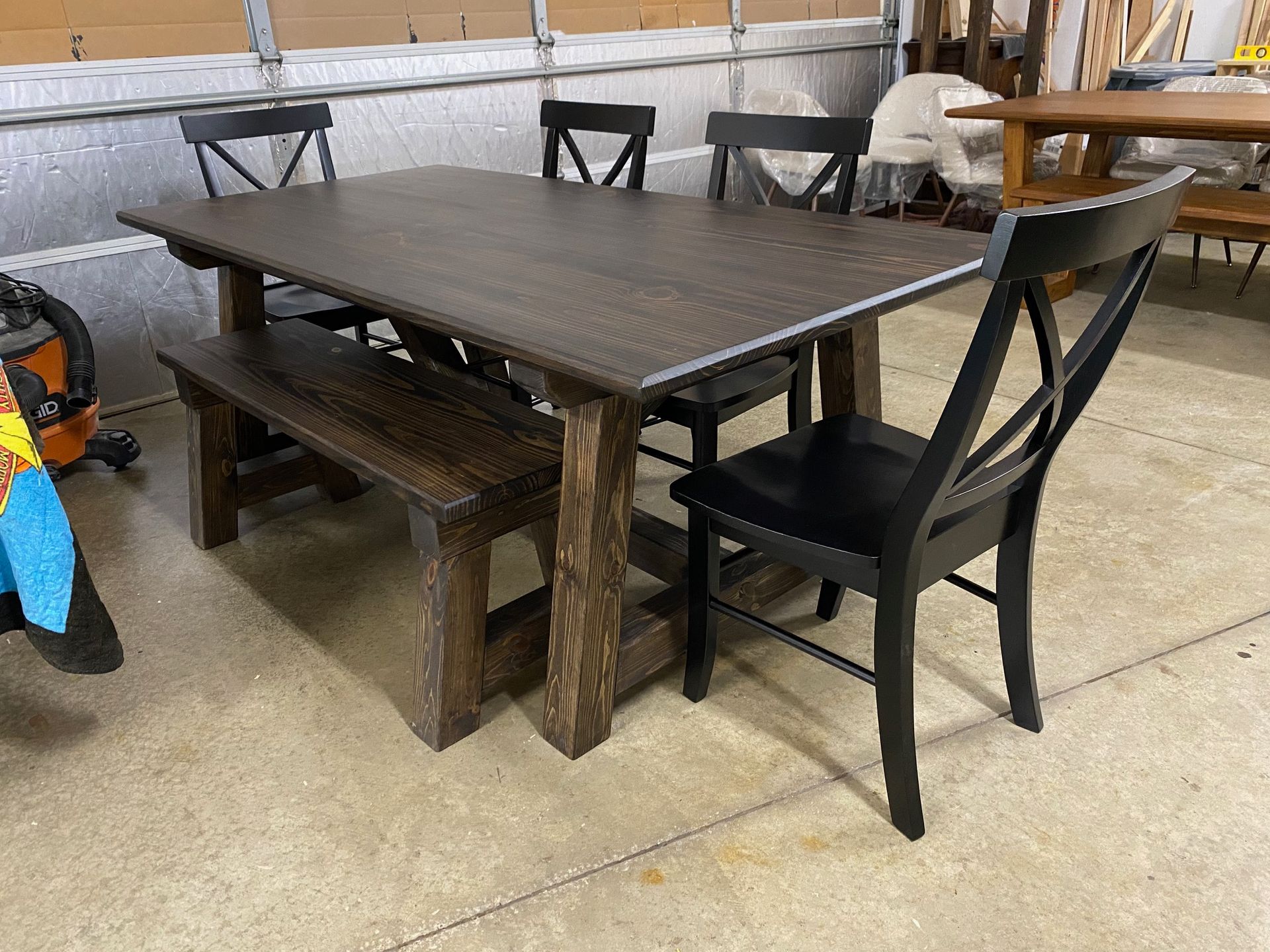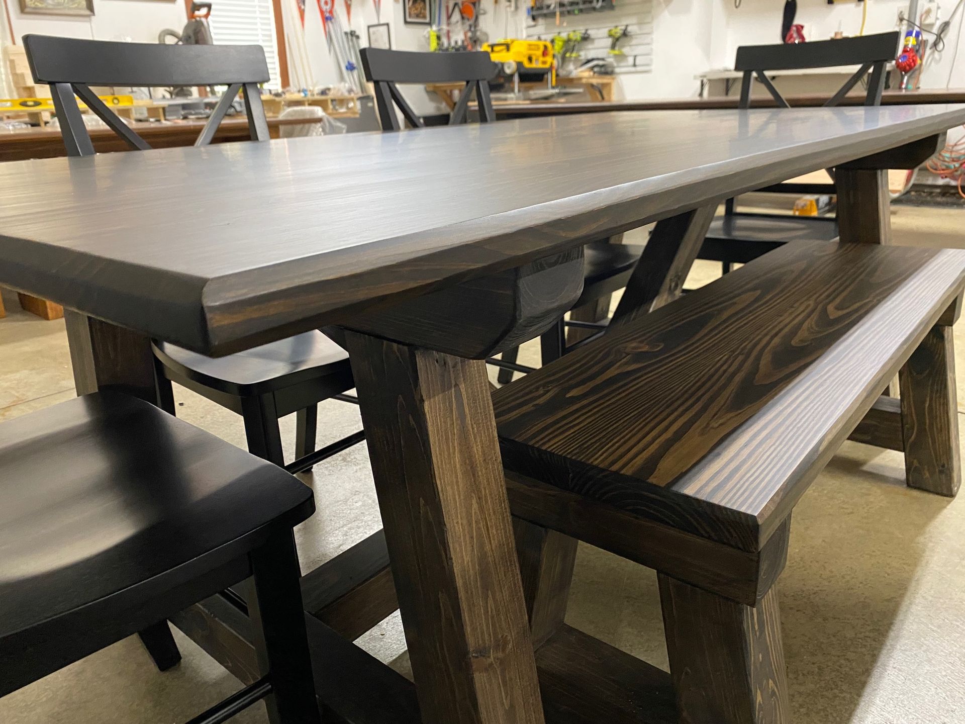 7ft Trestle Table. Oil Stained Espresso. Matching Bench and 4 Black Farmhouse Chairs. Finished in Matte Polyurethane.