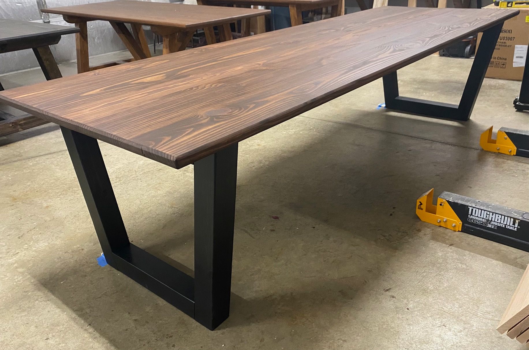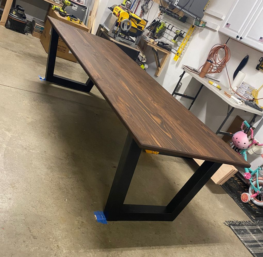 9.5ft Modern Dining Table. Base Oil Stained Black. Table Top Oil Stained Dark Walnut. Finished with Matte Polyurethane.